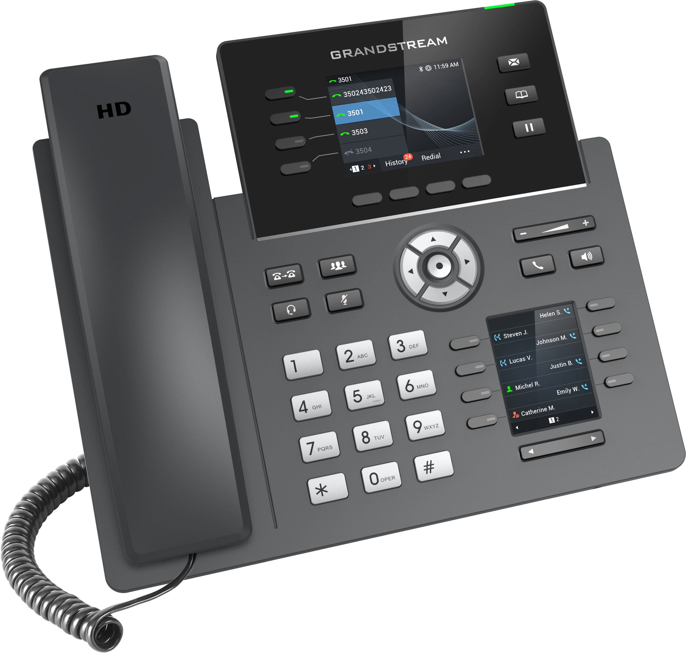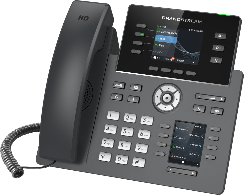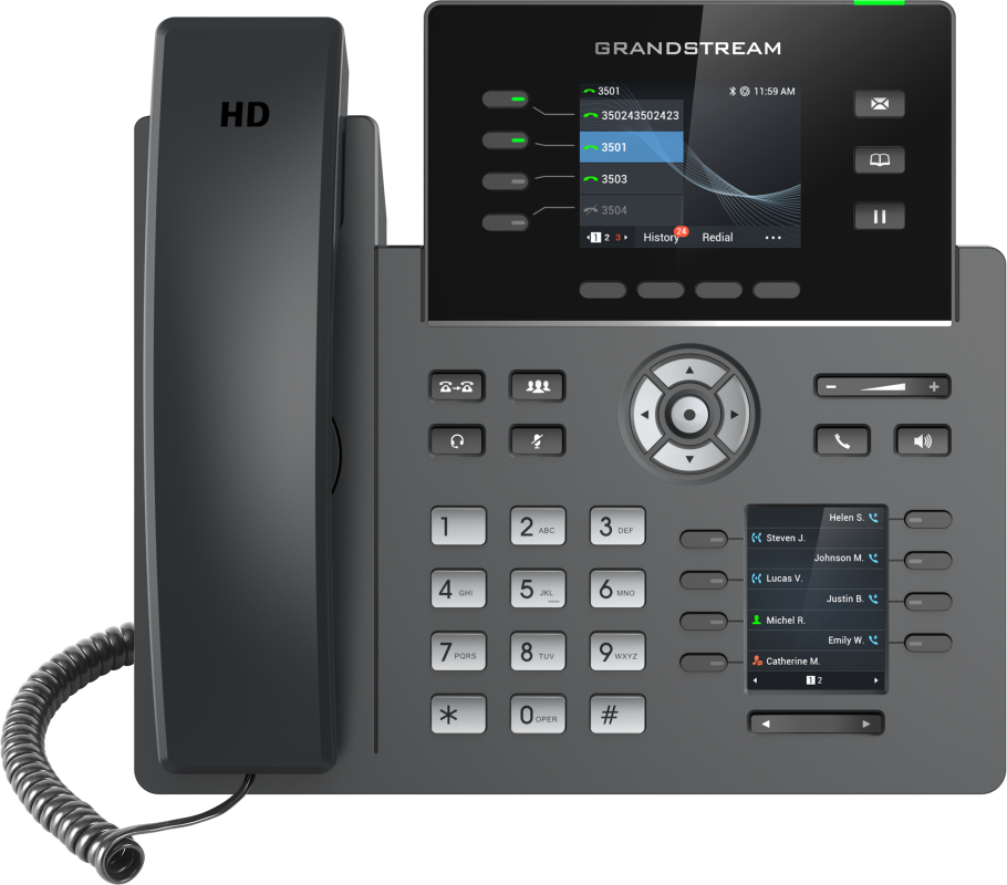 Grandstream GRP2614 şık bir tasarıma sahip olmakla birlikte ve 40 adet çok amaçlı tuşa (VPK) sahip çift LCD ekran, entegre WiFi, Bluetooth desteği, çift Gigabit bağlantı noktaları ve daha fazlasını içeren yeni nesil özellikler içerir. Bu cihaz, logoyu kolayca kişiselleştirmek için değiştirilebilir yüz plakalarına sahip renkli bir LCD ekrana sahiptir. GRP serisi, güvenli önyükleme, çift bellenim yazılımı görüntüleri ve şifreli veri depolama dahil işletme düzeyinde güvenlik sağlamak için taşıyıcı sınıfı güvenlik özellikleri içerir. Bulut sağlama ve merkezi yönetim için GRP2614, Grandstream uç noktalarının dağıtımlarını yapılandırmak, sağlamak, yönetmek ve izlemek için merkezi bir arayüz sağlayan Grandstream’in Aygıt Yönetim Sistemi (GDMS) tarafından desteklenmektedir.